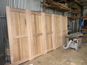 Timber doors An entire house lot of custom timber panel doors. Panelling is made from a mix of recycled Victorian hardwood flooring.